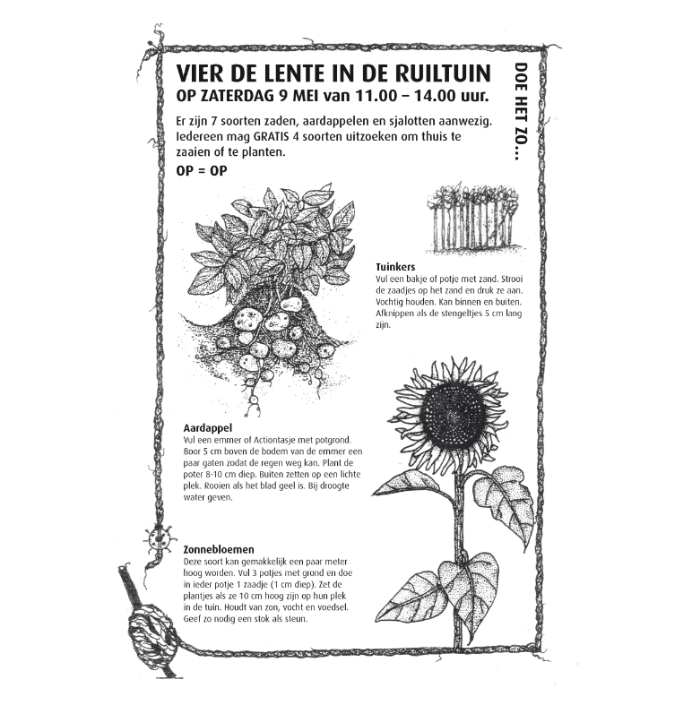Op zaterdag 9 mei staat de Ruiltuin open voor iedereen die zin heeft om te zaaien, te proeven en inspiratie op te doen. Bezoekers kunnen vier soorten kiezen uit vijf verschillende zaden: pluksla, eetbare pompoen, reuzenzonnebloem, lage Oost-Indische kers (de hele plant is eetbaar) en tuinkers. Daarnaast ligt er een pootaardappel en/of een sjalot klaar. Alles is gratis mee te nemen.