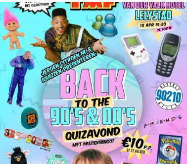 Het is weer tijd om je Flippo-album, Diddl stickers en Furby uit de kast te pakken en die Spice Girls CD en Aladdin videoband af te stoffen, Oefen vast op de songtekst van "I want it that way" of "Rainbow in the Sky" en open je MSN en Hyves nog een keertje want het is tijd voor de "Back to the 90's & 00's Quiz met Muziekbingo Editie 7" bij Van der Valk Lelystad op zaterdagavond 18 april.