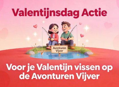 Op 14 februari is Valentijnsdag extra bijzonder bij Toms Creek. Boek een avontuurlijk vissen-ticket en neem gratis jouw Valentijn mee om samen te genieten van een vissessie op de Avonturenvijver.