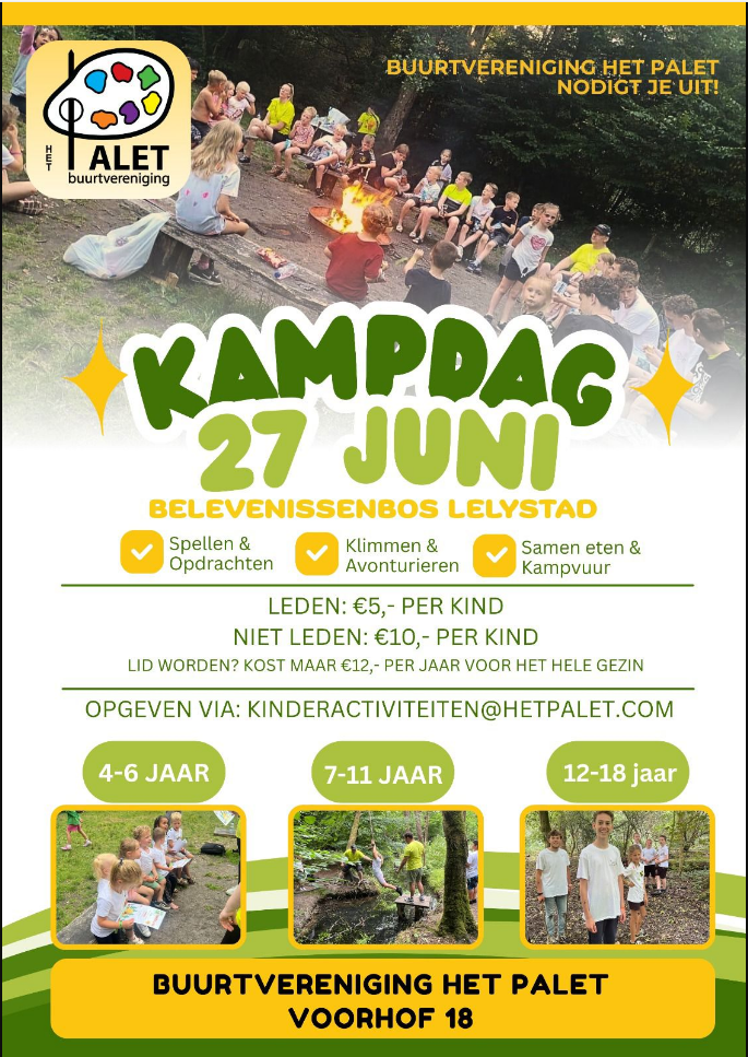 Buurtvereniging Het Palet nodigt alle kinderen en jongeren uit voor een superleuke kampdag op 27 juni 2026. Een dag vol actie, avontuur en gezelligheid in het prachtige Belevenissenbos.
