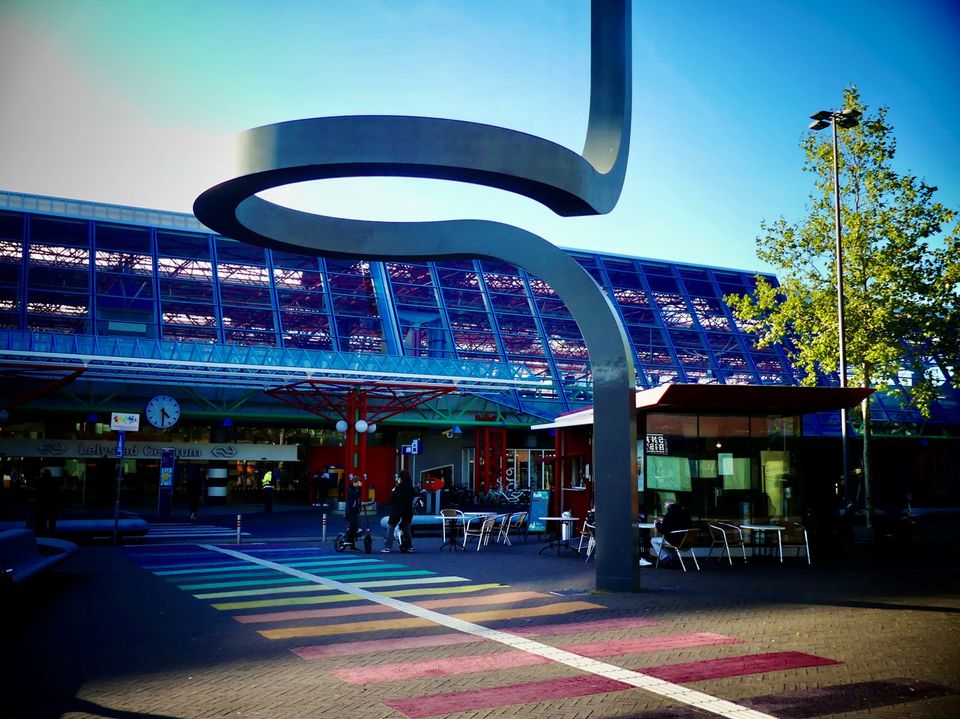 We eindigen waar we begonnen: bij het beeld “Gastvrijheid” en station Lelystad.